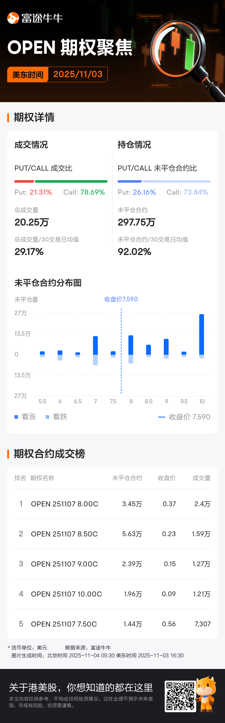 It shows that as of the close of the day, the open interest of $Opendoor Technologies (OPEN.US)$, indicating options positions have not been closed, totaled about 2.98 million contracts, which was 92.02% of the average of the past 30 trading days.