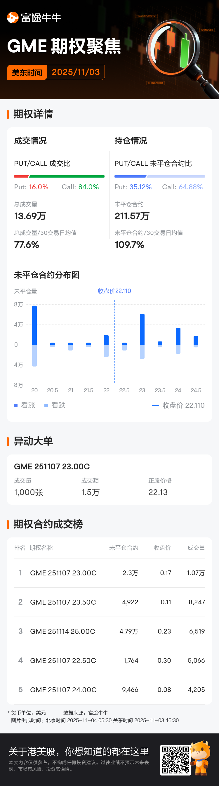 When $GameStop (GME.US)$ was trading at $22.13, the call option with $23.00 of strike price expiring on November 7th,2025 transacted 1,000 contracts. It ranked first among $GameStop (GME.US)$ unusual option trades of the day and reflected $15,000 turnover.