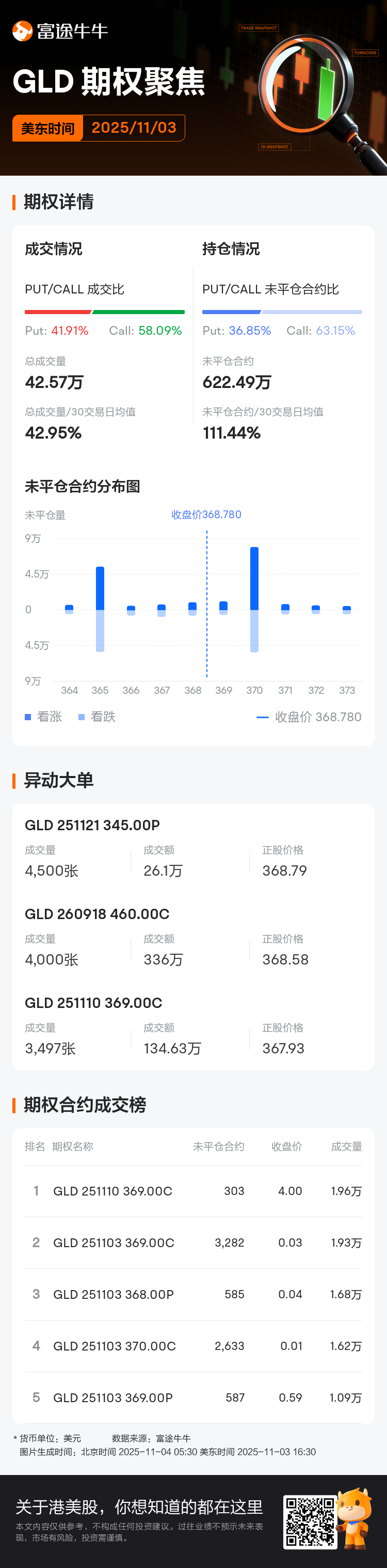 When $SPDR Gold ETF (GLD.US)$ was trading at $368.79, the put option with $345.00 of strike price expiring on November 21st,2025 transacted 4,500 contracts. It ranked first among $SPDR Gold ETF (GLD.US)$ unusual option trades of the day and reflected $261K turnover.