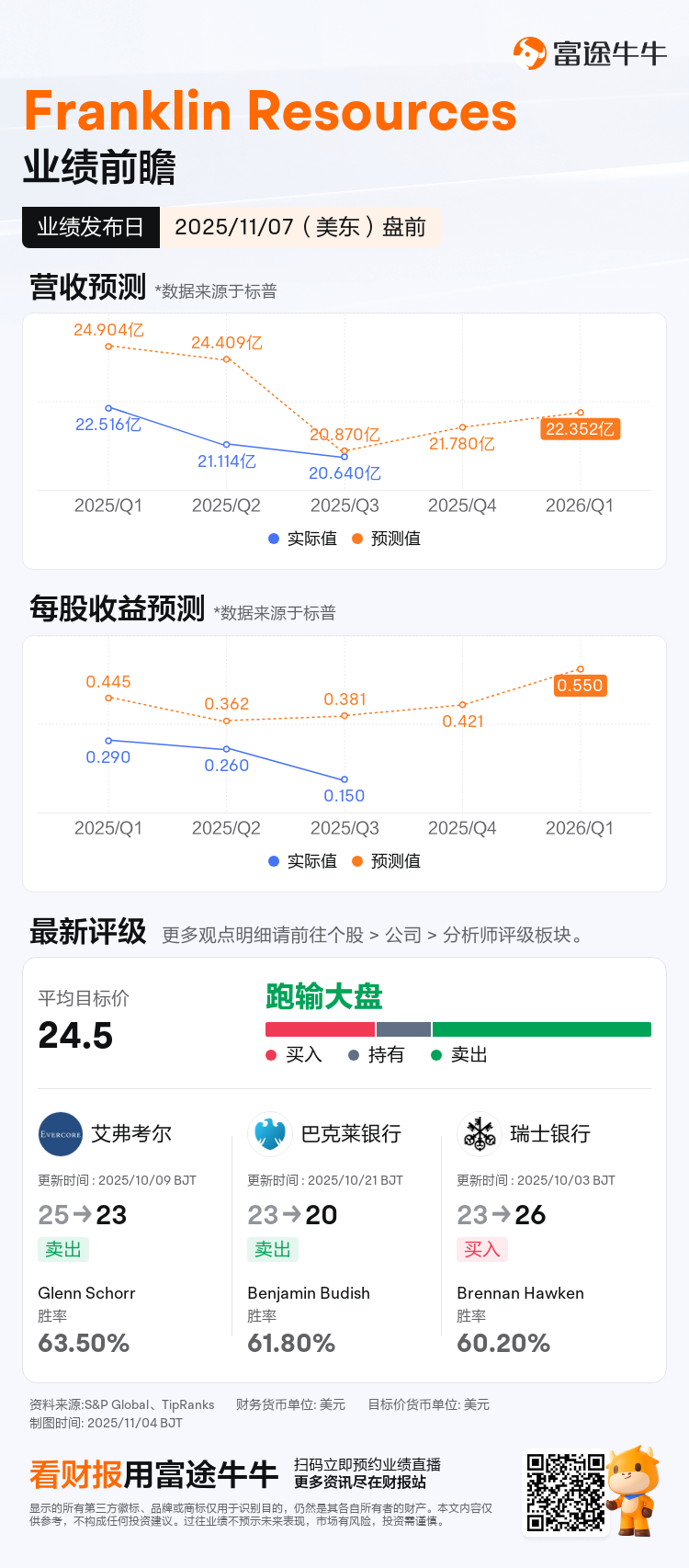 $Franklin Resources (BEN.US)$ is scheduled to release its financial results pre-market on November 07 ET.