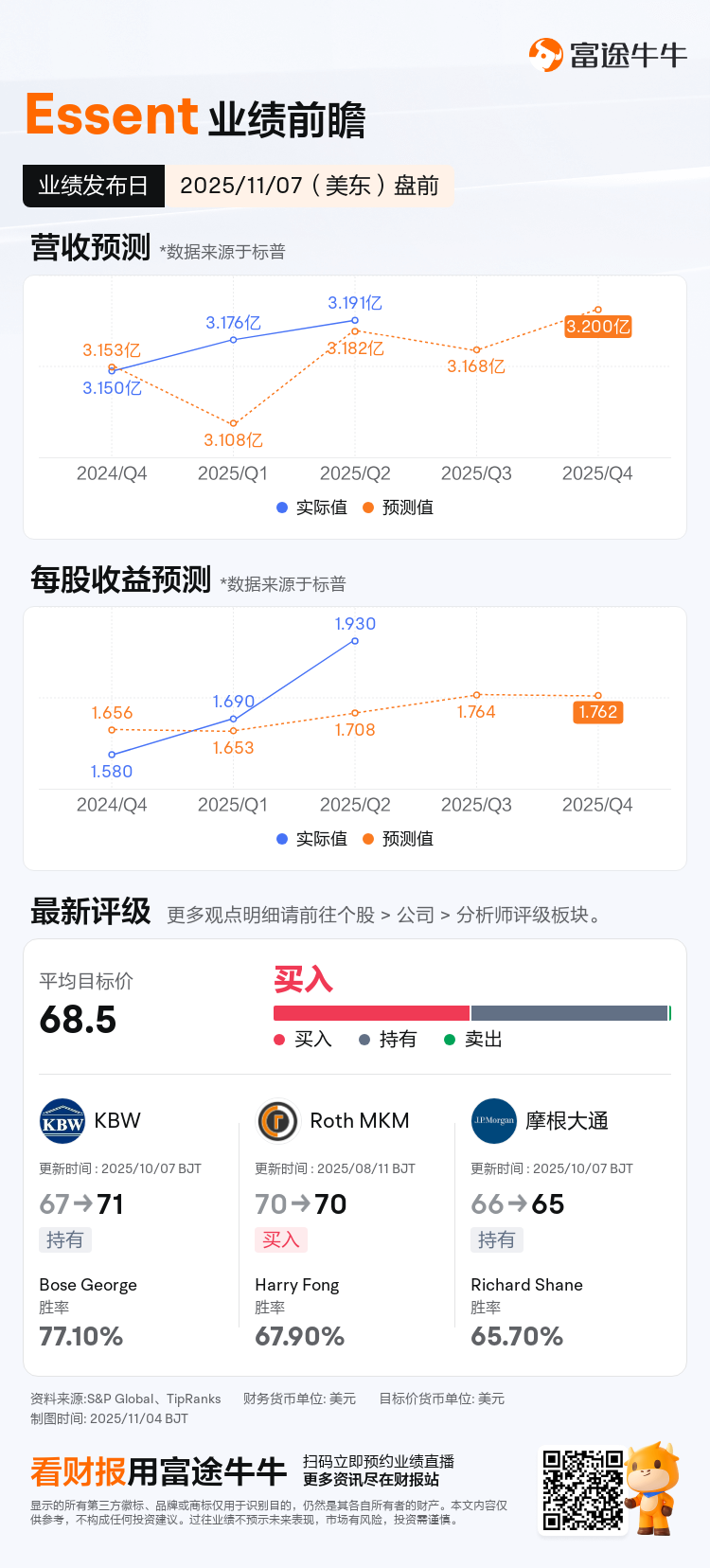 Analysts estimate $Essent (ESNT.US)$ to post revenue of USD316.75M for 2025Q3, up 0.05% YOY;