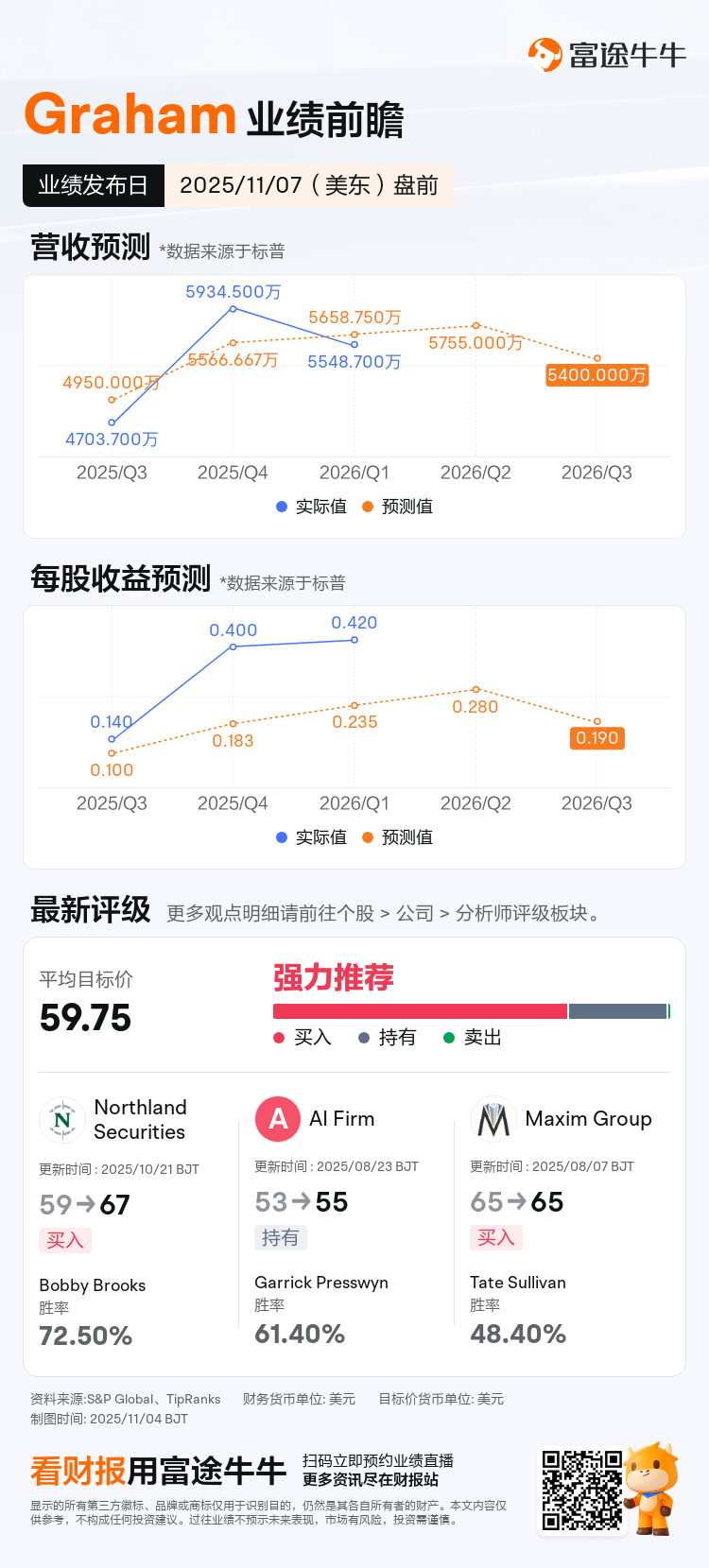 Analysts estimate $Graham (GHM.US)$ to post revenue of USD57.55M for 2026Q2, up 7.44% YOY;
