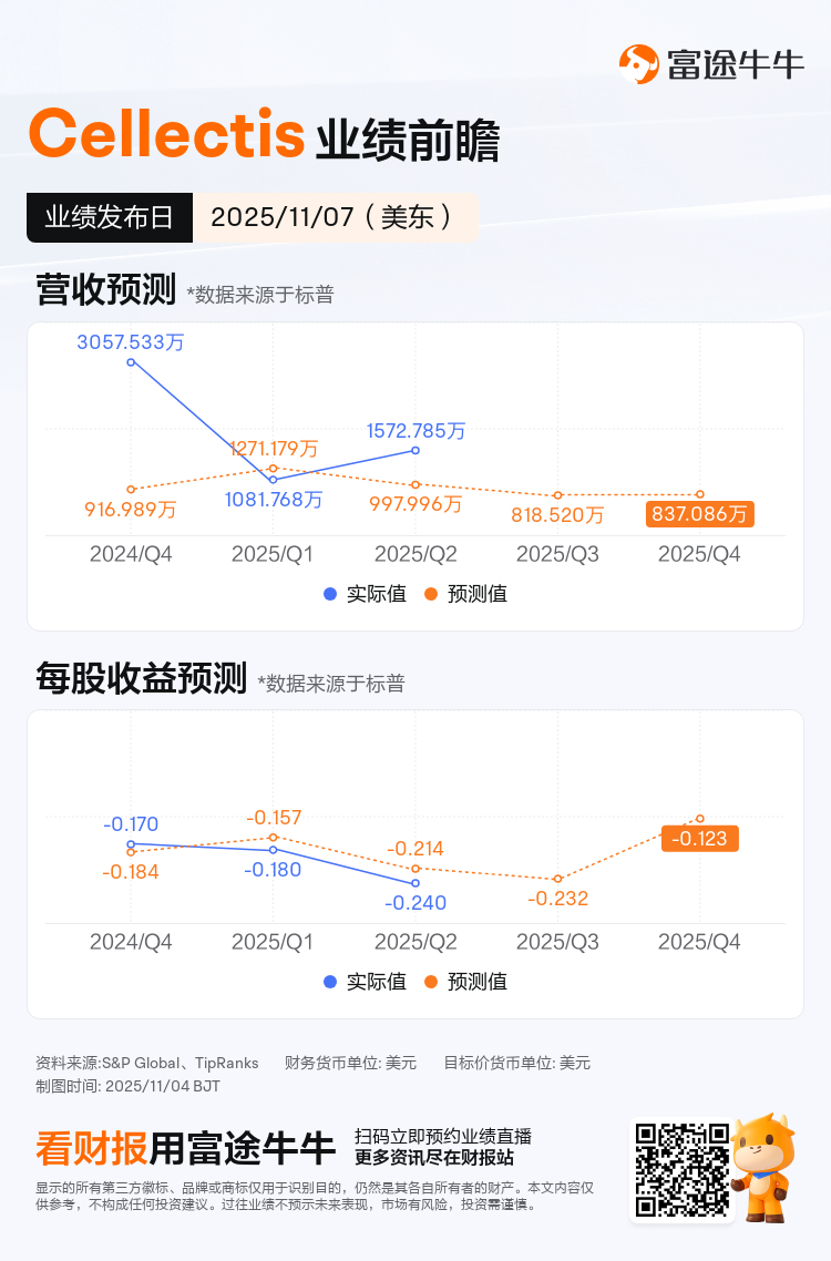 Analysts estimate $Cellectis (CLLS.US)$ to post revenue of USD9.60M for 2025Q3, down 47.98% YoY;