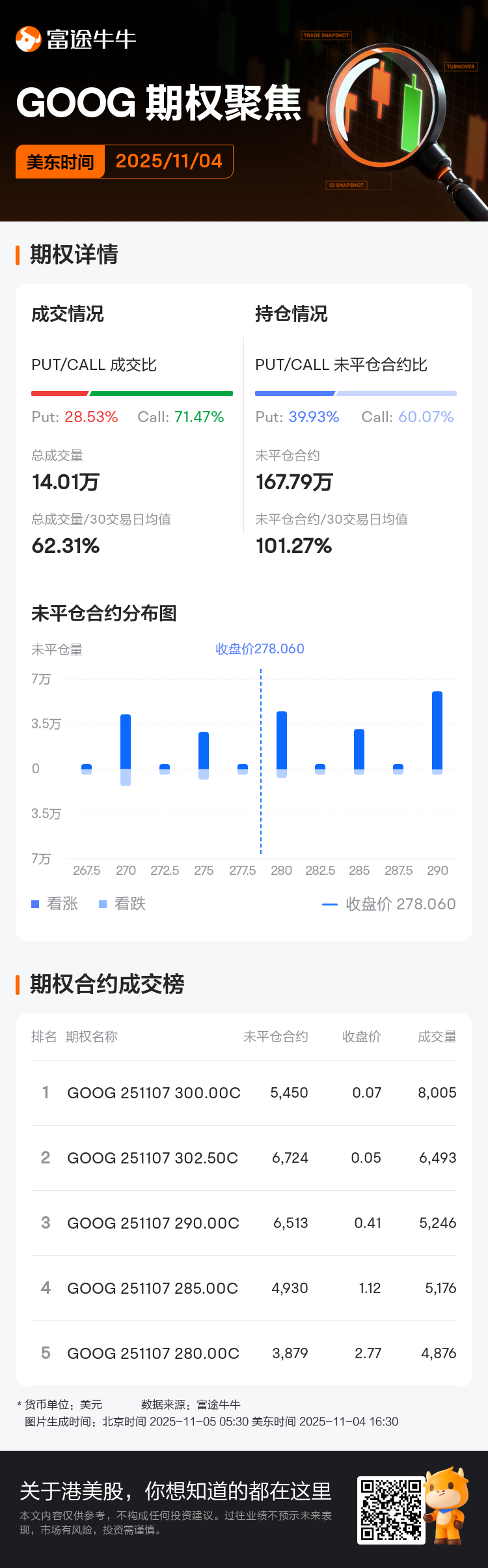 On November 4th ET, $Alphabet-C (GOOG.US)$ had active options trading, with a total trading volume of 140.07K options for the day, of which put options accounted for 28.53% of the total transactions, and call options accounted for 71.47%.