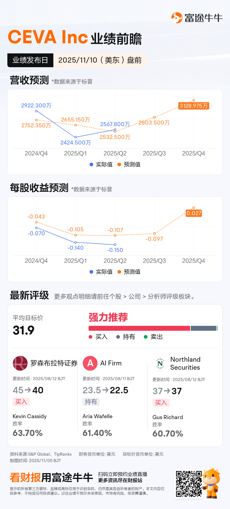$CEVA Inc (CEVA.US)$ is scheduled to release its financial results pre-market on November 10 ET.