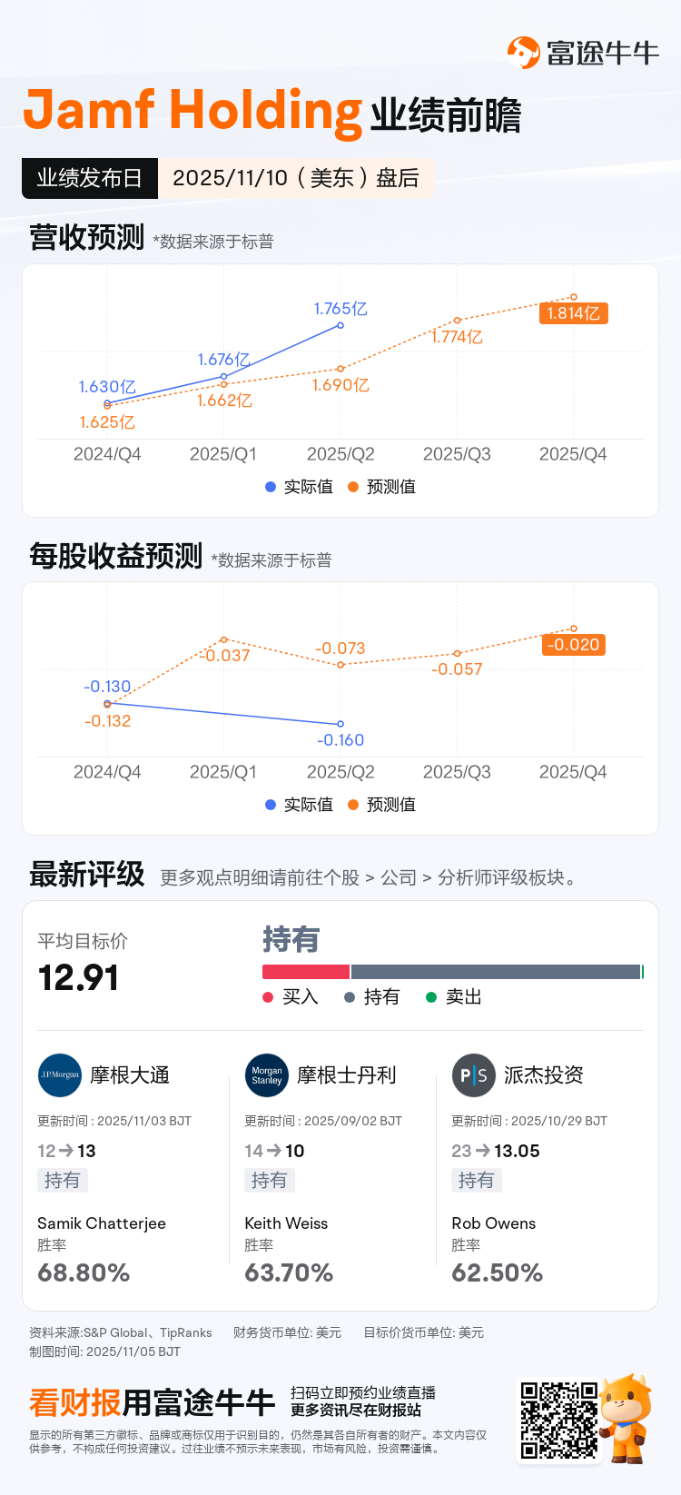 Analysts estimate $Jamf Holding (JAMF.US)$ to post revenue of USD177.37M for 2025Q3, up 11.36% YOY;