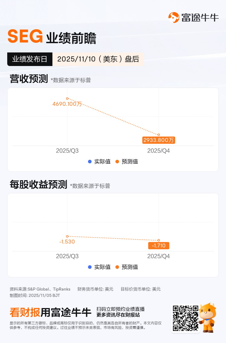 Analysts estimate $Seaport Entertainment Group (SEG.US)$ to post revenue of USD46.90M for 2025Q3, EPS is estimated to be USD-1.530.The accounting standard used for the above data is US-GAAP.