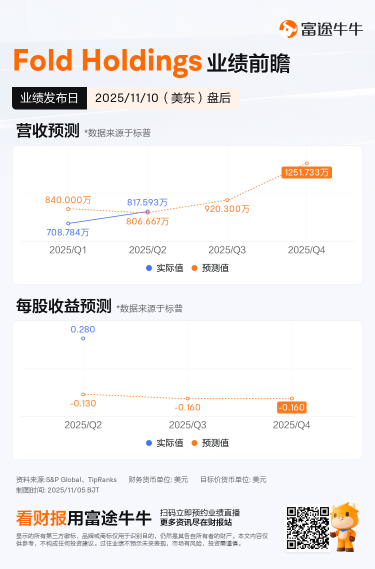 Analysts estimate $Fold Holdings (FLD.US)$ to post revenue of USD9.20M for 2025Q3, EPS is estimated to be USD-0.160.Note: