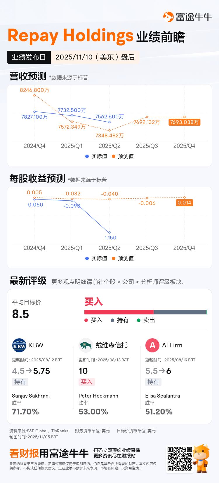 Analysts estimate $Repay Holdings (RPAY.US)$ to post revenue of USD76.92M for 2025Q3, down 2.81% YoY;