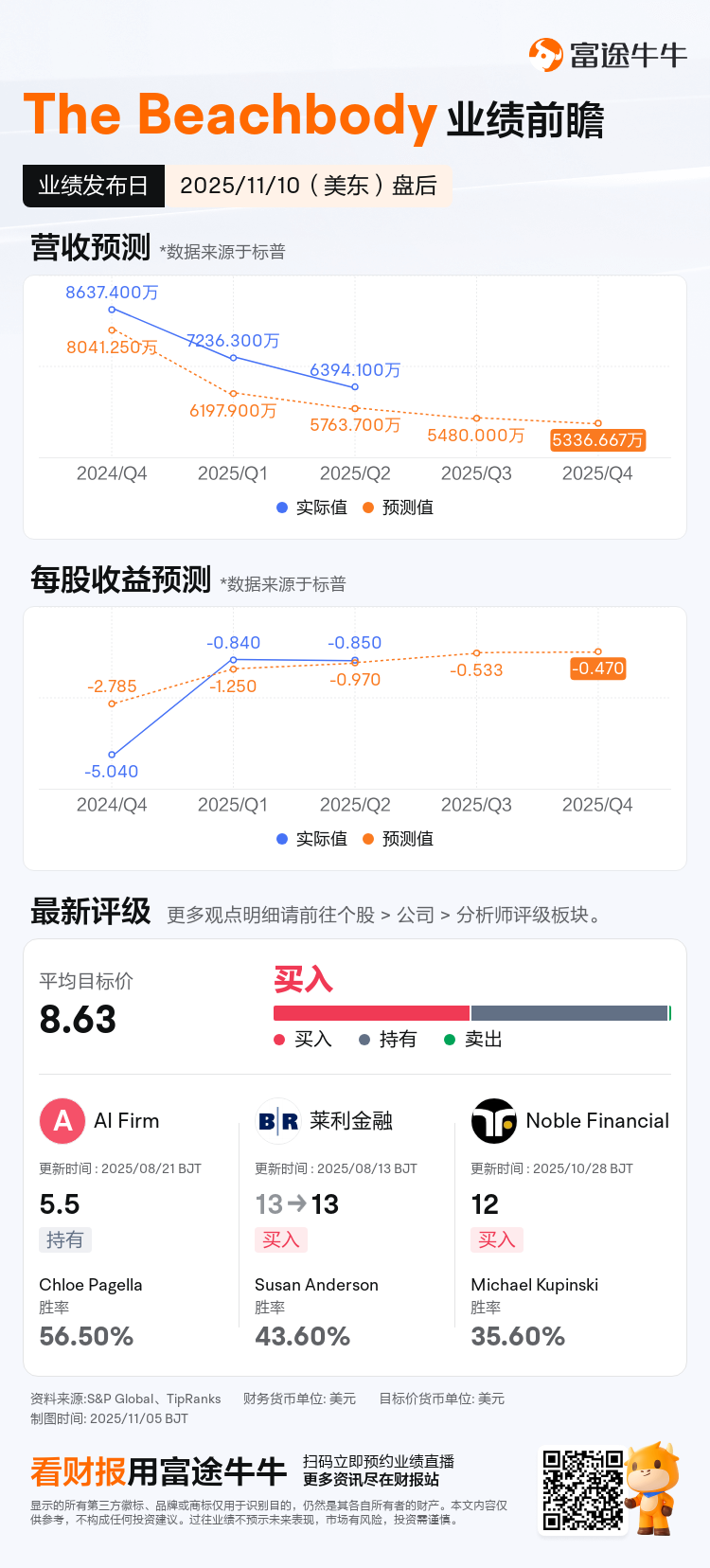 Analysts estimate $The Beachbody (BODI.US)$ to post revenue of USD54.80M for 2025Q3, down 46.38% YoY;