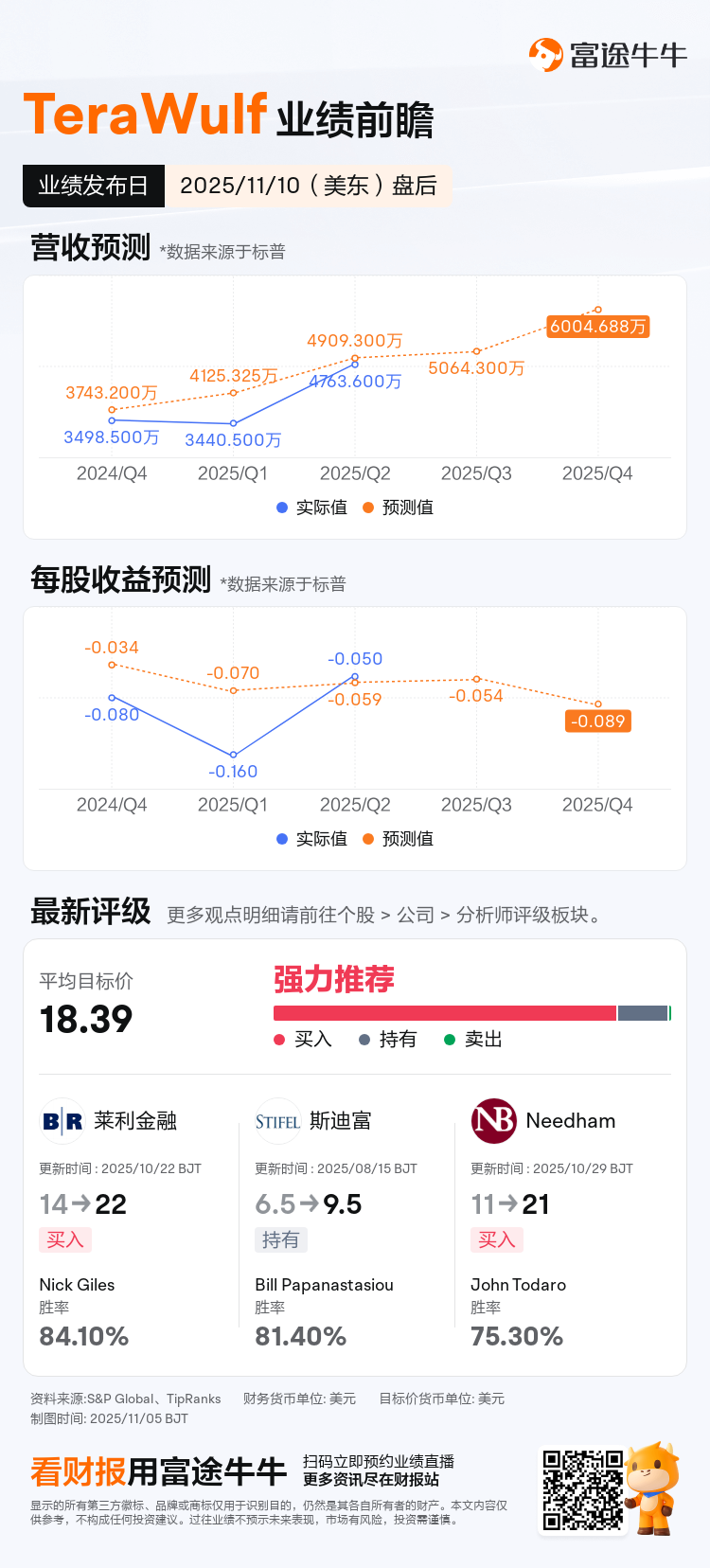 Analysts estimate $TeraWulf (WULF.US)$ to post revenue of USD50.64M for 2025Q3, up 87.16% YOY;