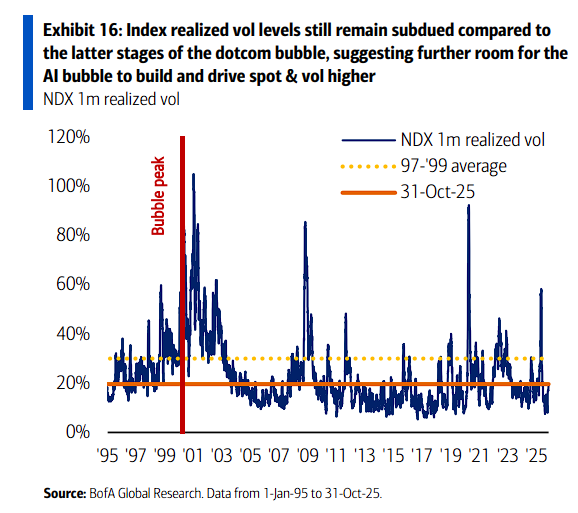 Realized volatility remains relatively contained: The report specifically pointed out that the Nasdaq 100 Index’s (NDX) one-month realized volatility is still "quite mild" compared to levels seen at the peak of the dot-com bubble. During the bubble’s apex in late 1999, the NDX’s average realized volatility was as high as 93%, whereas the current level remains significantly lower.