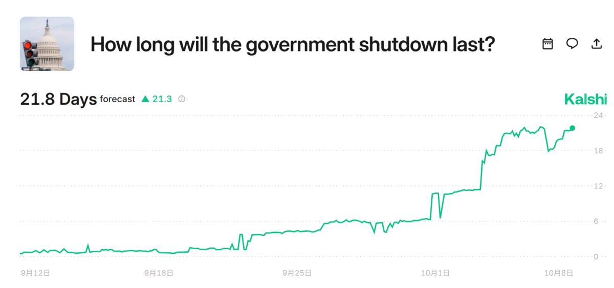 與此同時,美國政府的停擺進入了第七天,多項經濟報告被迫延期。預測平台kalshi的最新數據顯示,這一輪停擺可能會超過20天。