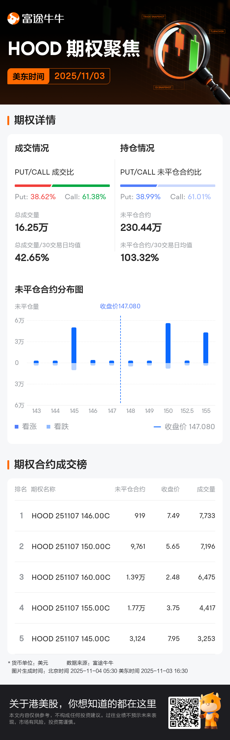 數據顯示,截至當日收盤,$Robinhood (HOOD.US)$未平倉合約(即沒有買賣或行權的期權合約)總計約230.44萬張,與其近30個交易日均值比為103.32%。