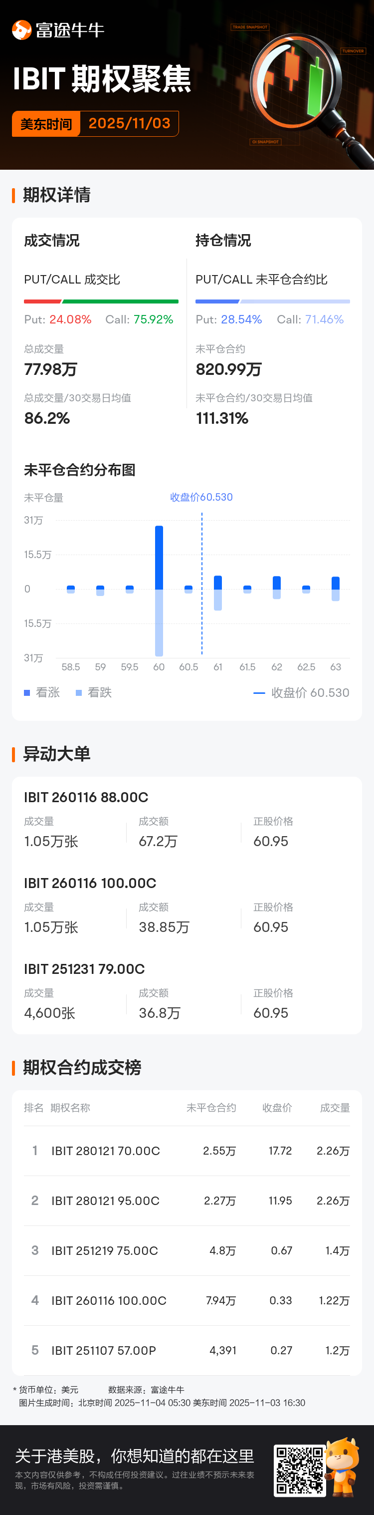 美東時間11月3日,$比特幣ETF-iShares (IBIT.US)$期權成交活躍,當日期權總成交量達77.98萬張,其中認沽期權佔總成交量的24.08%,認購期權佔75.92%。