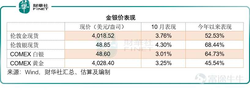 貴金屬市場更上演「過山車」行情,現貨銀於10月中旬一度突破54.142美元,但隨後回落,現爲每盎司48.85美元;現貨金也一度突破4,355.685美元水平,市場樂觀預期5,000美元指日可待,但隨後急跌,現報4,018.52美元。