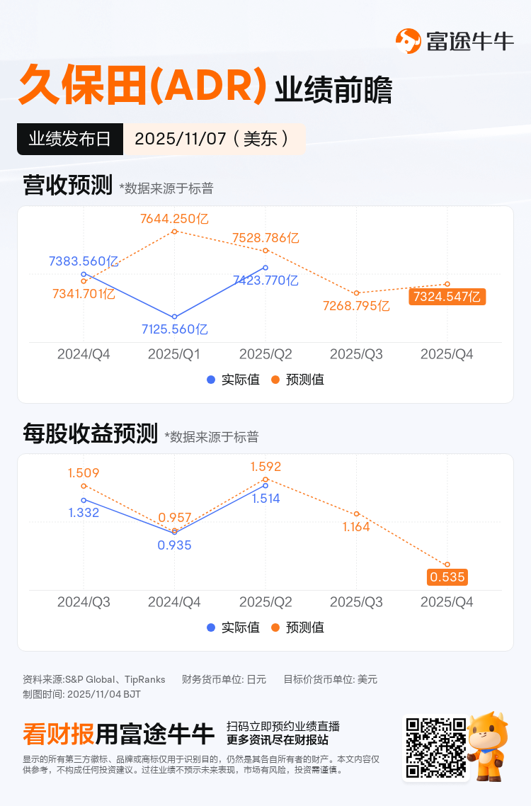 機構預期$久保田(ADR) (KUBTY.US)$2025Q3預計實現營收7268.80億日元,按年增加4.09%;