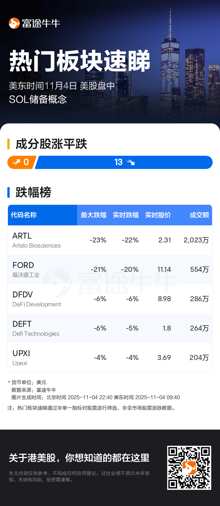 美東時間11月4日報道,今日美股盤中$SOL儲備概念 (LIST23797.US)$走勢疲弱,截至發稿,板塊中13只成份股下跌,Artelo Biosciences領跌板塊。