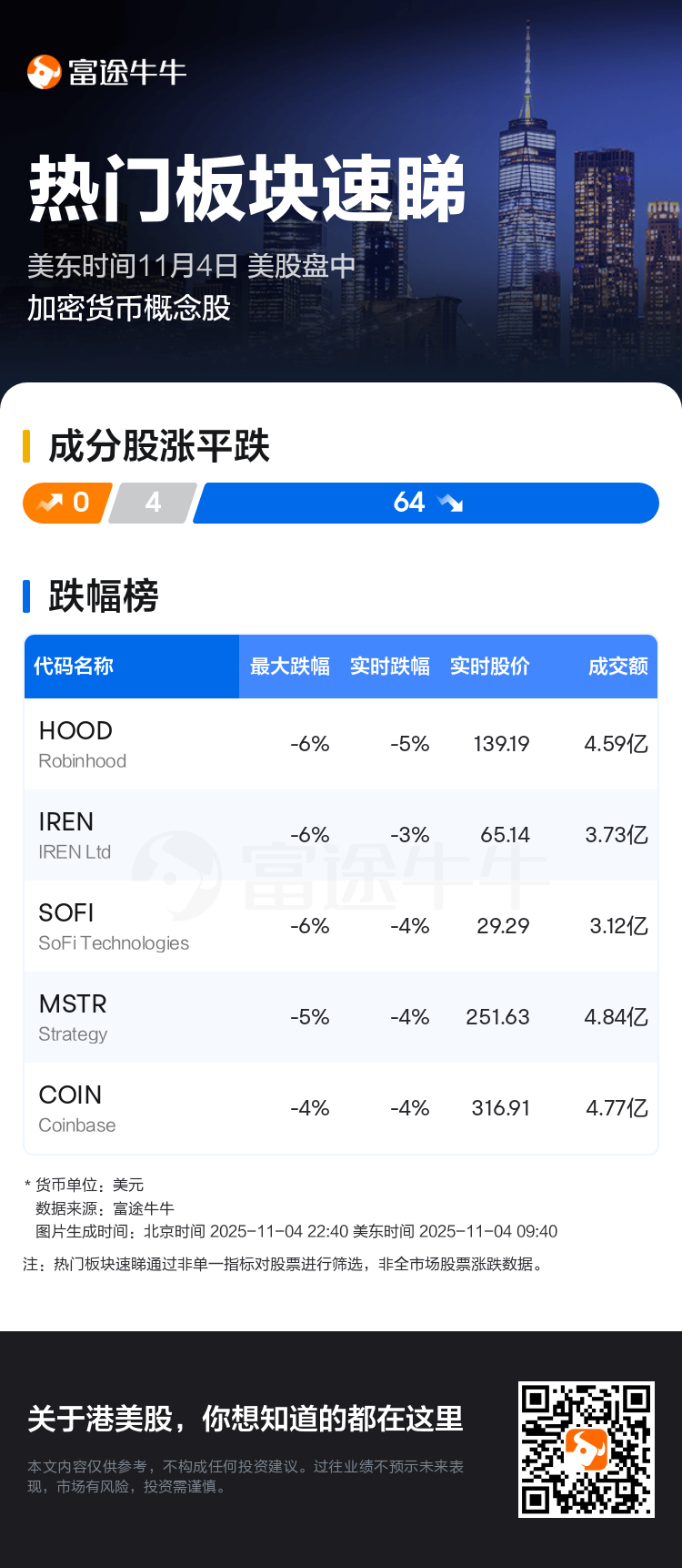 美東時間11月4日報道,今日美股盤中$加密貨幣概念股 (LIST20010.US)$走勢疲弱,截至發稿,板塊中64只成份股下跌,Robinhood領跌板塊。