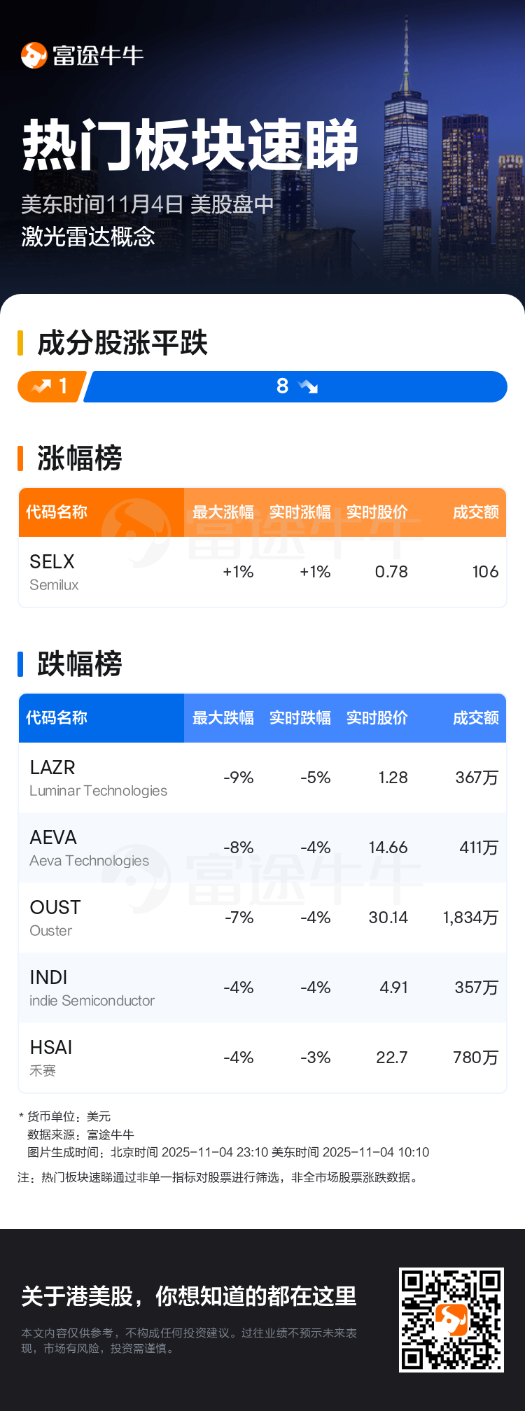美東時間11月4日報道,今日美股盤中$激光雷達概念 (LIST2539.US)$走勢疲弱,截至發稿,板塊中1只成份股上升,8只成份股下跌,Luminar Technologies領跌板塊。