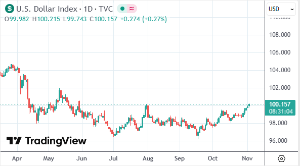 財聯社11月4日訊(編輯 趙昊)週二(11月4日)歐洲時段,美元指數自8月初以來首度升破100關口,最高報100.21,爲三個月來的最高水平。