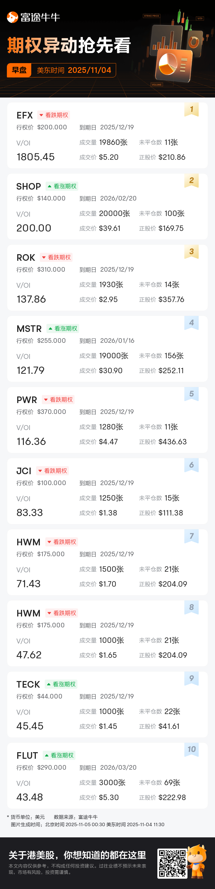 $艾可菲 (EFX.US)$的一筆認沽期權成交量達到了1.99万張,遠超過其未平倉數11張,V/OI值高達1805.45,該交易涉資1,032.72萬美元。該合約的行使價為200.000美元,到期日為45天后的2025年12月19日。