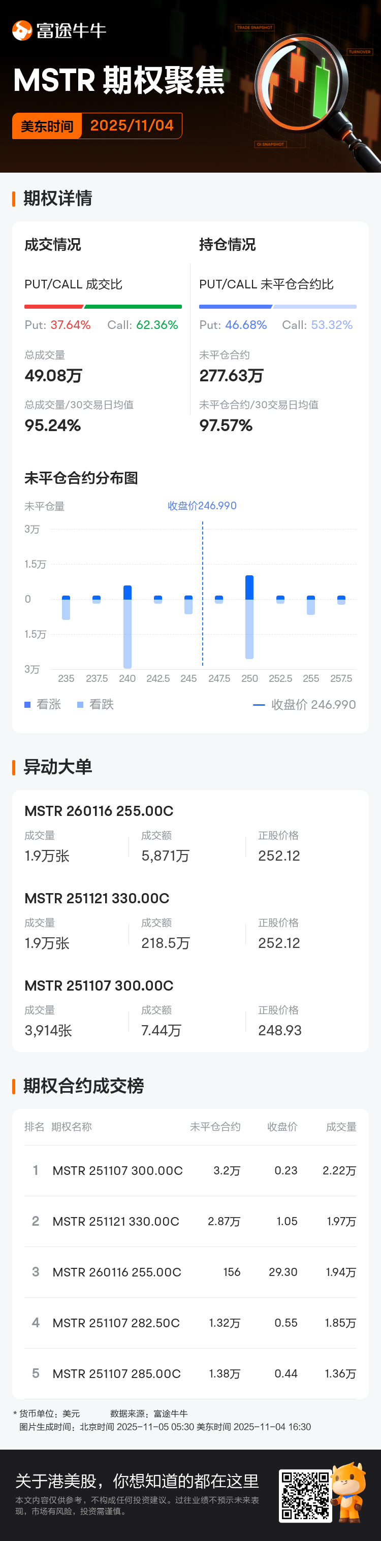 美東時間11月4日,$Strategy (MSTR.US)$期權成交活躍,當日期權總成交量達49.08萬張,其中認沽期權佔總成交量的37.64%,認購期權佔62.36%。