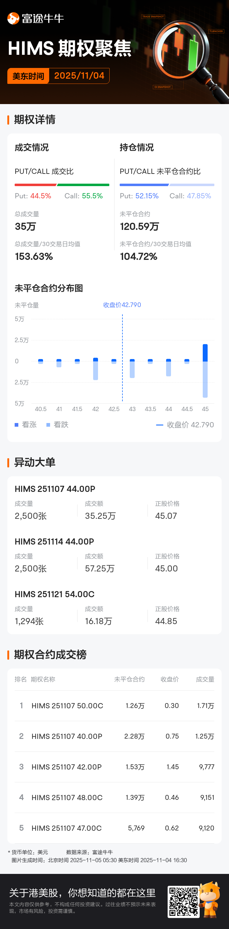 美東時間11月4日,$Hims & Hers Health (HIMS.US)$期權成交活躍,當日期權總成交量達35萬張,其中認沽期權佔總成交量的44.5%,認購期權佔55.5%。