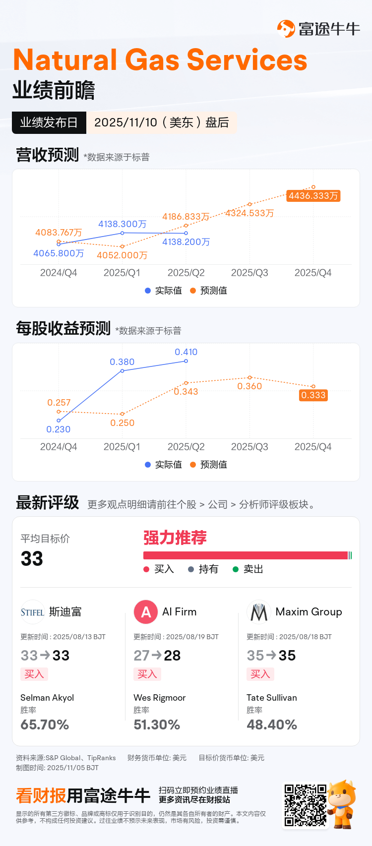 機構預期$Natural Gas Services (NGS.US)$2025Q3預計實現營收4324.53萬美元,按年增加6.29%;