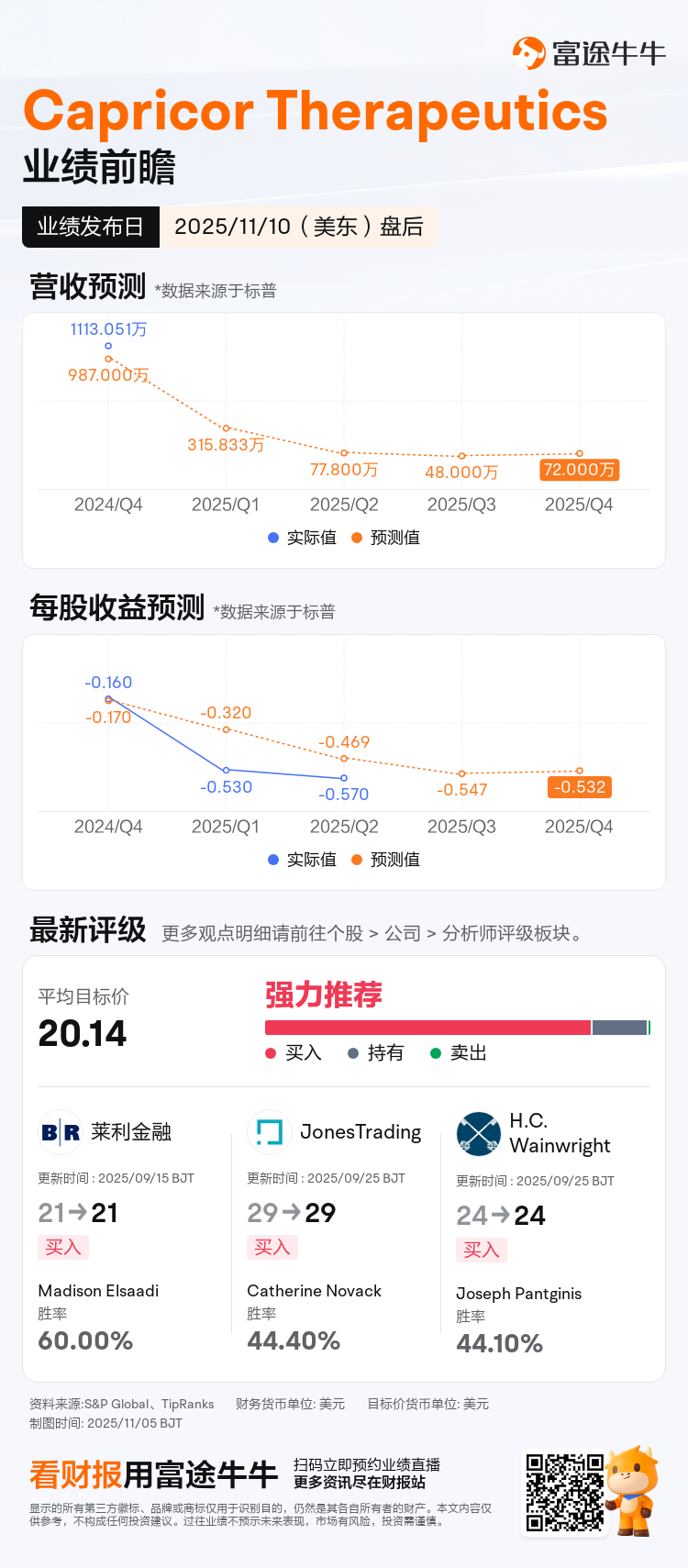機構預期$Capricor Therapeutics (CAPR.US)$2025Q3預計實現營收48.00萬美元,按年減少78.78%;