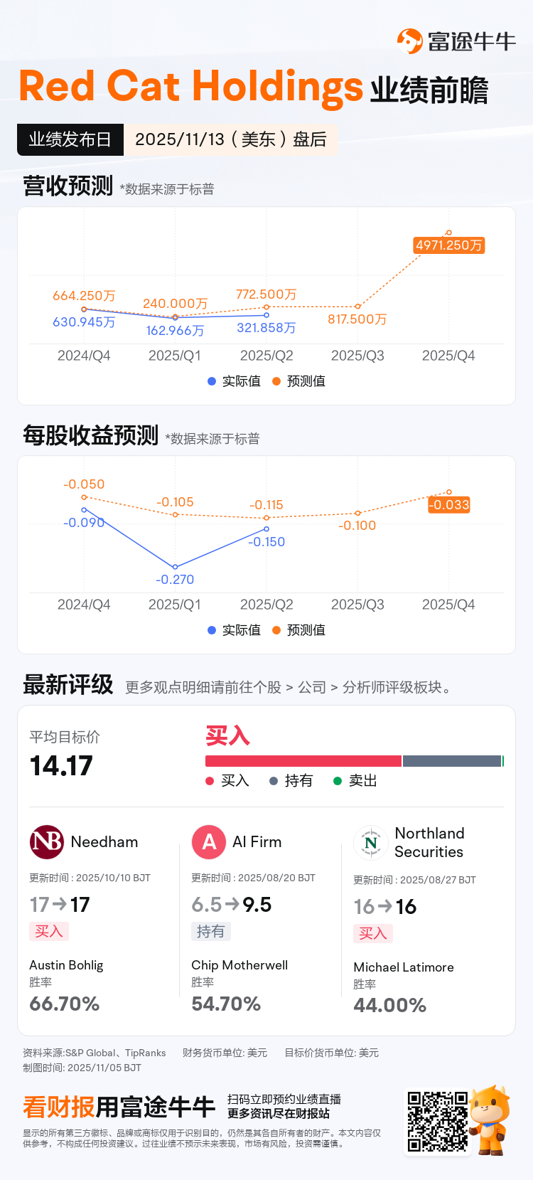 $Red Cat Holdings (RCAT.US)$將於美東時間11月13日盤後發佈業績,投資者敬請留意。