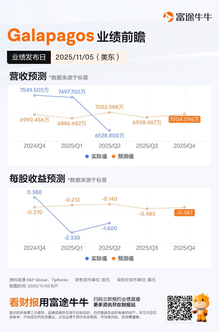 機構預期$Galapagos (GLPG.US)$2025Q3預計實現營收6908.49萬歐元,按年增加15.43%;